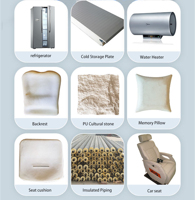 In insulation filled polyurethane products foaming, such as: floor heating board, aircraft table board, integrated wall board, cold storage board, insulation board, insulation box, insulation water tank, hot water machine, kitchen board, steamed rice cabinet and other industries.