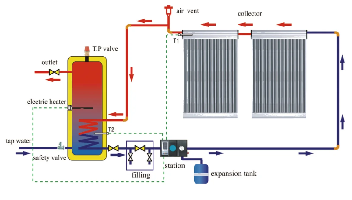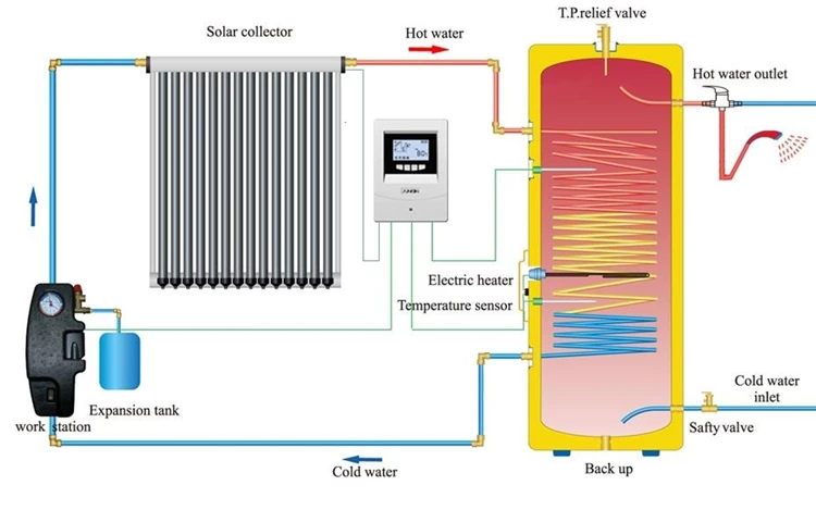 Features: 1.The solar collector is separated with the solar tank,can be located anywhere. 2.Solar collector can be mounted on building in different styles. 3.Copper pipe solar collector with anti-freezing fluid inside the tubes will achieve high anti freezing effect. 4.Intelligent control system is reliable and convenient. 5.Pressurized operation will guarantee sufficient water flow. 6.Solar water heater heating system can be connected with auxiliary heating system at the preset joint.This split solar water heating system is a desirable domestic hot water system. Functions: 1.Constant temperature circulation: adopt the auto.Circulation system to realized constant temperature of the water inside thesolar system;Ex-factory default is to ensure the constant temperature of water inside the system and pipelines. 2.Overheat protection: It includes protection of solar collector and electric booster.The former will be operated by the controller automatically to ensure the safety of the solar collector and the solar heat storage system;the later will be controlled by the temperature sensor automatically, to make sure the booster work in a safety condition.Take manual operation to resume to the working condition. 3.Pressure limitation: It functions by automatically sensing the pressure and temperature of the parts,so as to ensure the normal operation of the system. 4.Anti-freezing: It is realized through the circulation of the working fluid to make sure the safety of the operation at the limited temperature.Working principle: This split solar water heating system has solar collectors on the roof and water tanks inside the house,and transfers heat energy collected by the collectors into the tank by natural or forced circulation of the working fluid between collector and the tank. The system comprises of collectors,a water tank,a controller,pumps and valves.